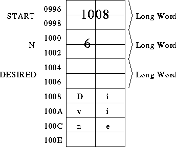 1: MOVEA.L START,A0 # 2 words, 2 data accesses. 2: MOVEA.L N,A1 # 2 words, 2 data accesses. 3: ADDA.L A0,A1 # 1 word. 4: MOVEA.L A0,A2 # 1 word. 5: MOVE.B (A0)+,D0 # 1 word, 1 data access. 6:LOOP CMP.B (A0)+,D0 # 1 word, 1 data access. 7: BLE NXT # 1 word. 8: LEA -1(A0),A2 # 2 words. 9: MOVE.B (A2),D0 # 1 word, 1 data access. 10:NXT CMPA.L A0,A1 # 1 word. 11: BGT LOOP # 1 word. 12: MOVE.L A2,DESIRED # 2 words, 2 data accesses.