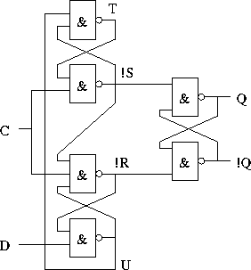 Rising edge triggered D flip-flop. Figure 4-13 uses eight NAND gates and three inverters (verify for yourself). A slight improvement:
